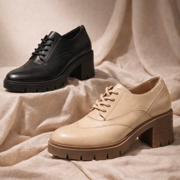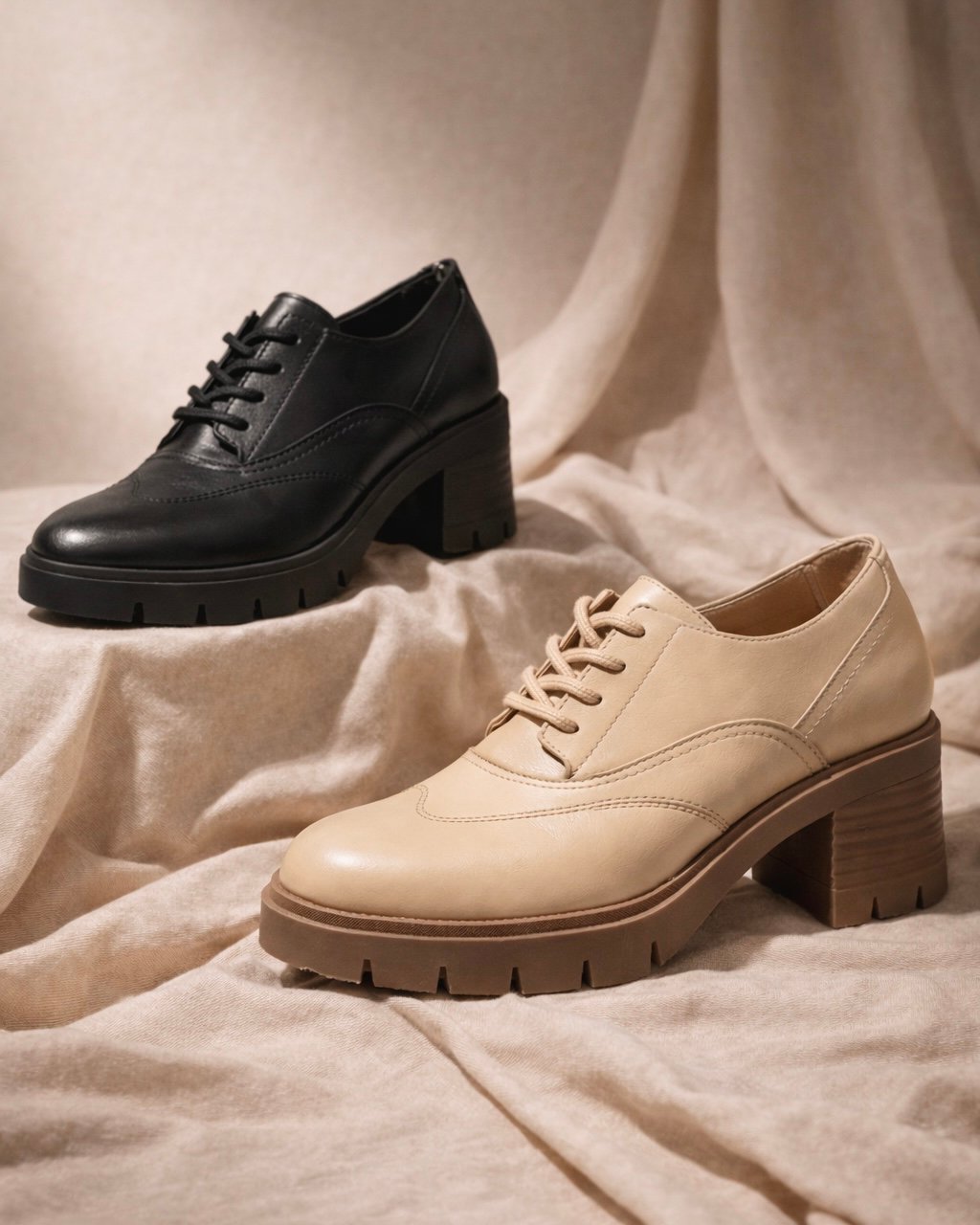 Կաշվե բարձրակրունկ կոշիկներ՝ երբ ուզում եք ավելի հավաք կերպար, բայց չեք պատրաստվում զոհաբերել հարմարավետ քայլքը։ Այս մոդելը համադրում է բնական կաշվի նուրբ տեսքը, կապիչով (lace-up) ամրացումը և կայուն, հաստ կրունկը՝ առօրյա smart casual ու ավելի դասական համադրությունների համար։ Հաստ, ռելիեֆային տակացուն օգնում է քայլել վստահ՝ հատկապես ակտիվ օրերին։